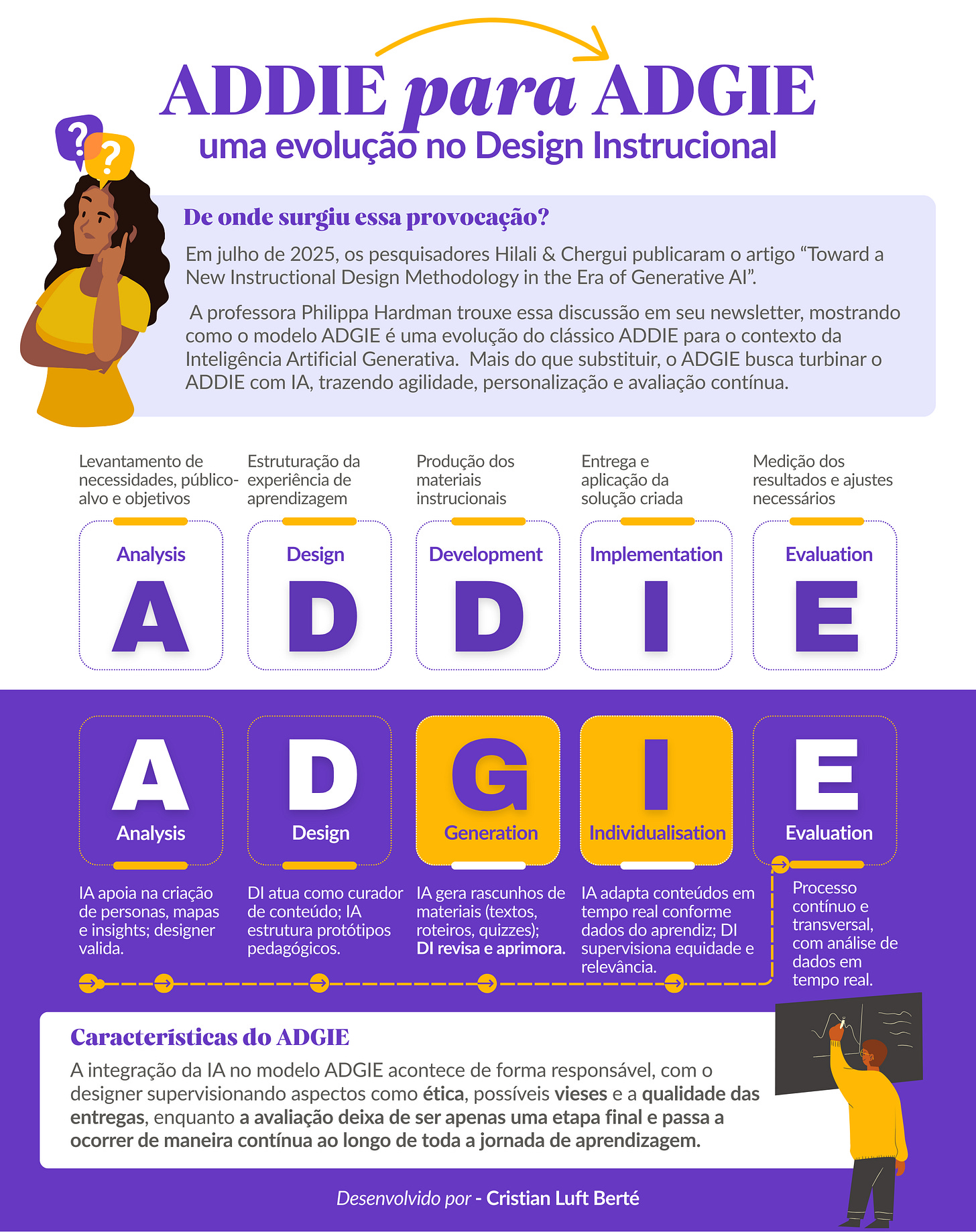 E nesse cenário, a inteligência artificial já começa a ocupar espaço dentro dos frameworks tradicionais. Hoje, já falamos em ADGIE, um modelo que atualiza o ADDIE para incorporar a IA em cada etapa do processo.